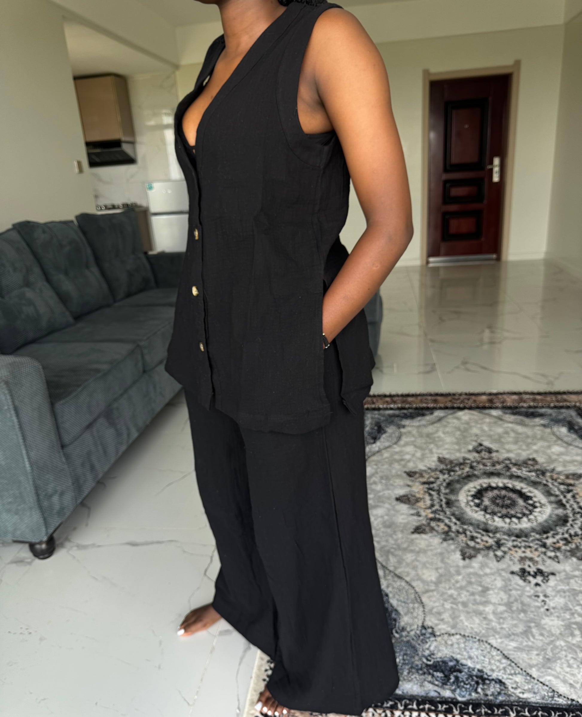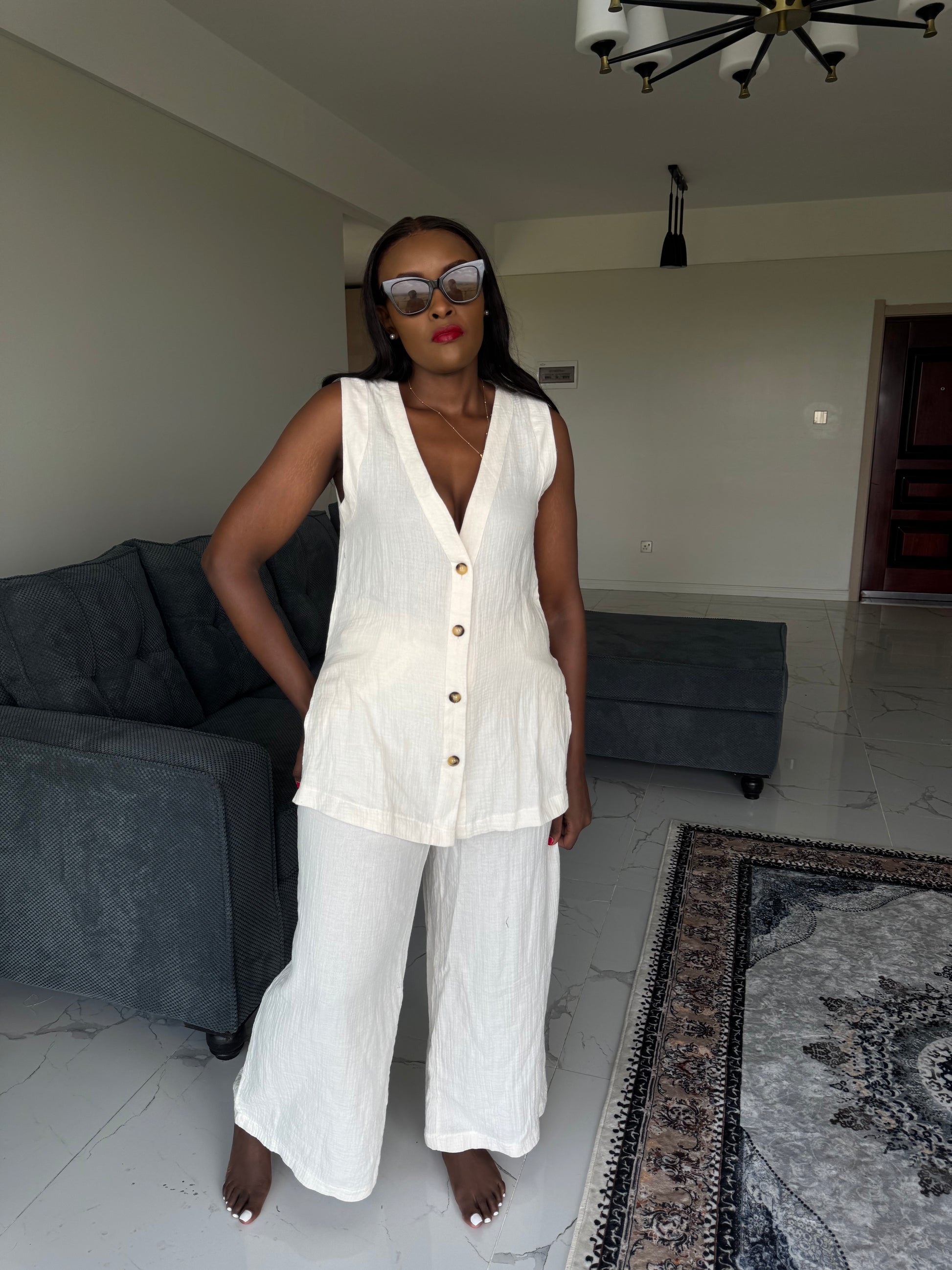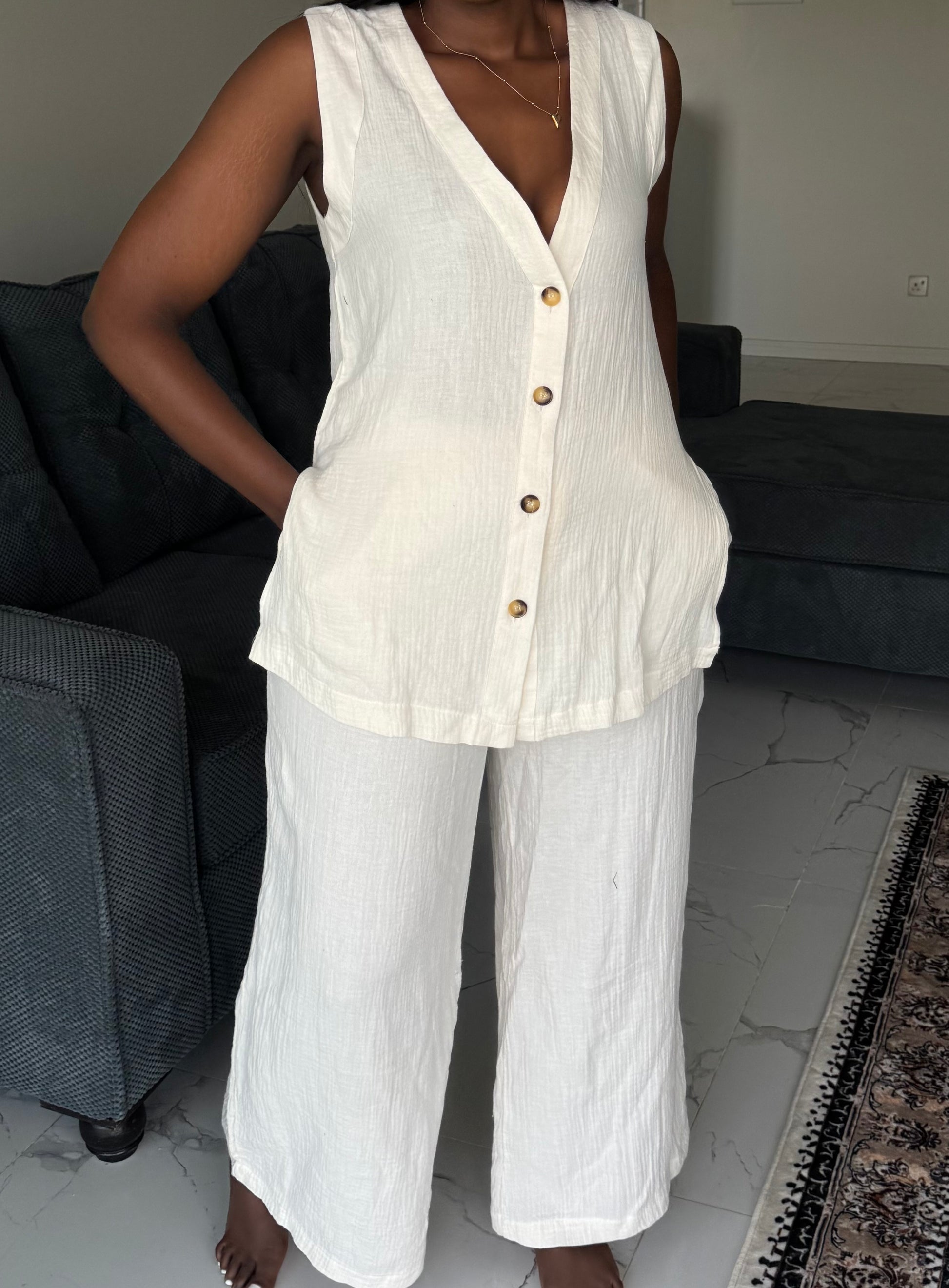 Inspired by sun-warmed streets and effortless resort style, the Marrakech linen-blend set is your go-to for a relaxed look. Crafted from a breathable linen blend, this sleeveless top and matching pants set is designed to keep you cool while looking effortlessly put together.