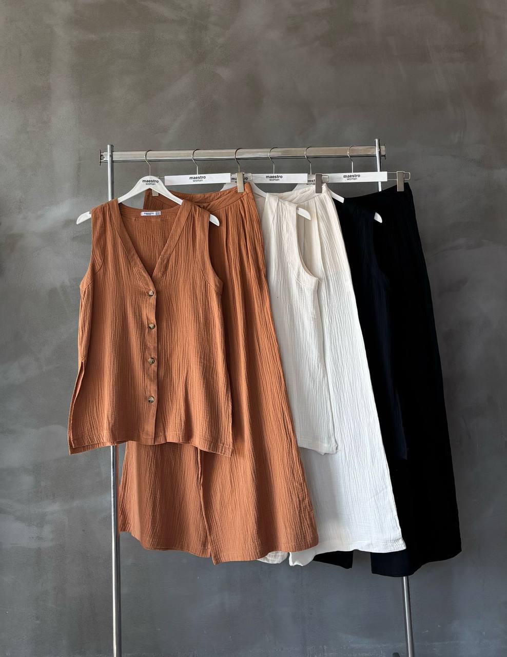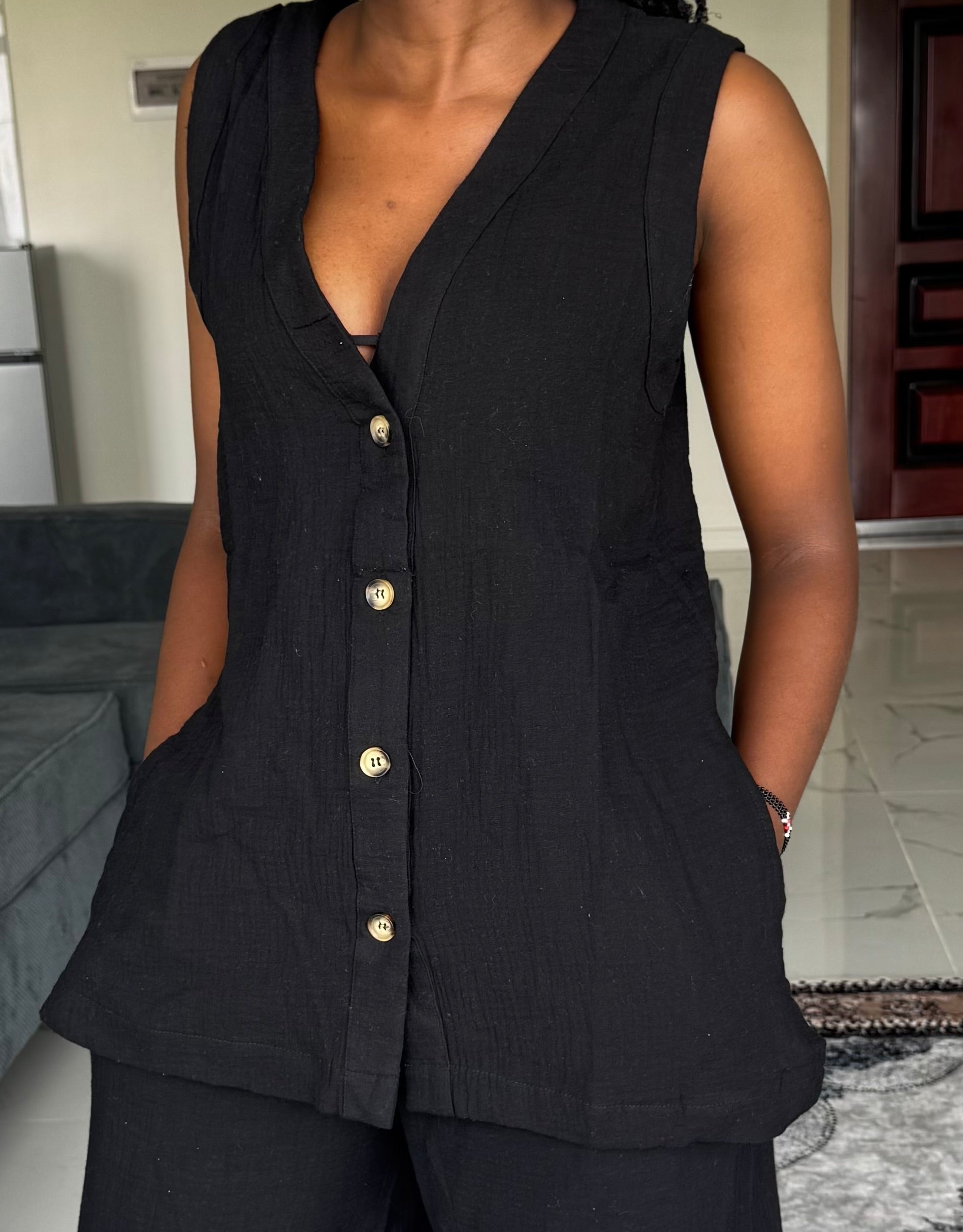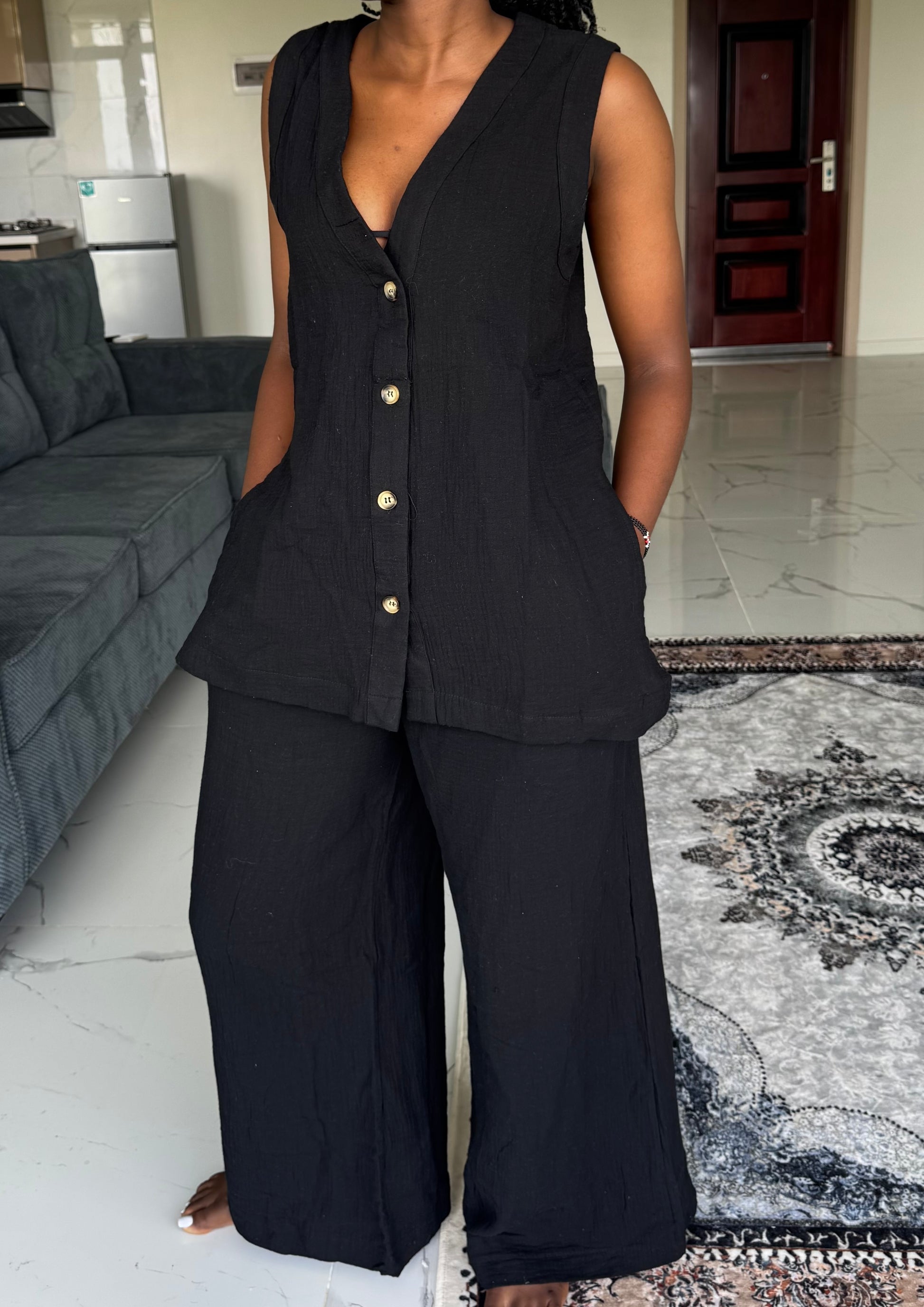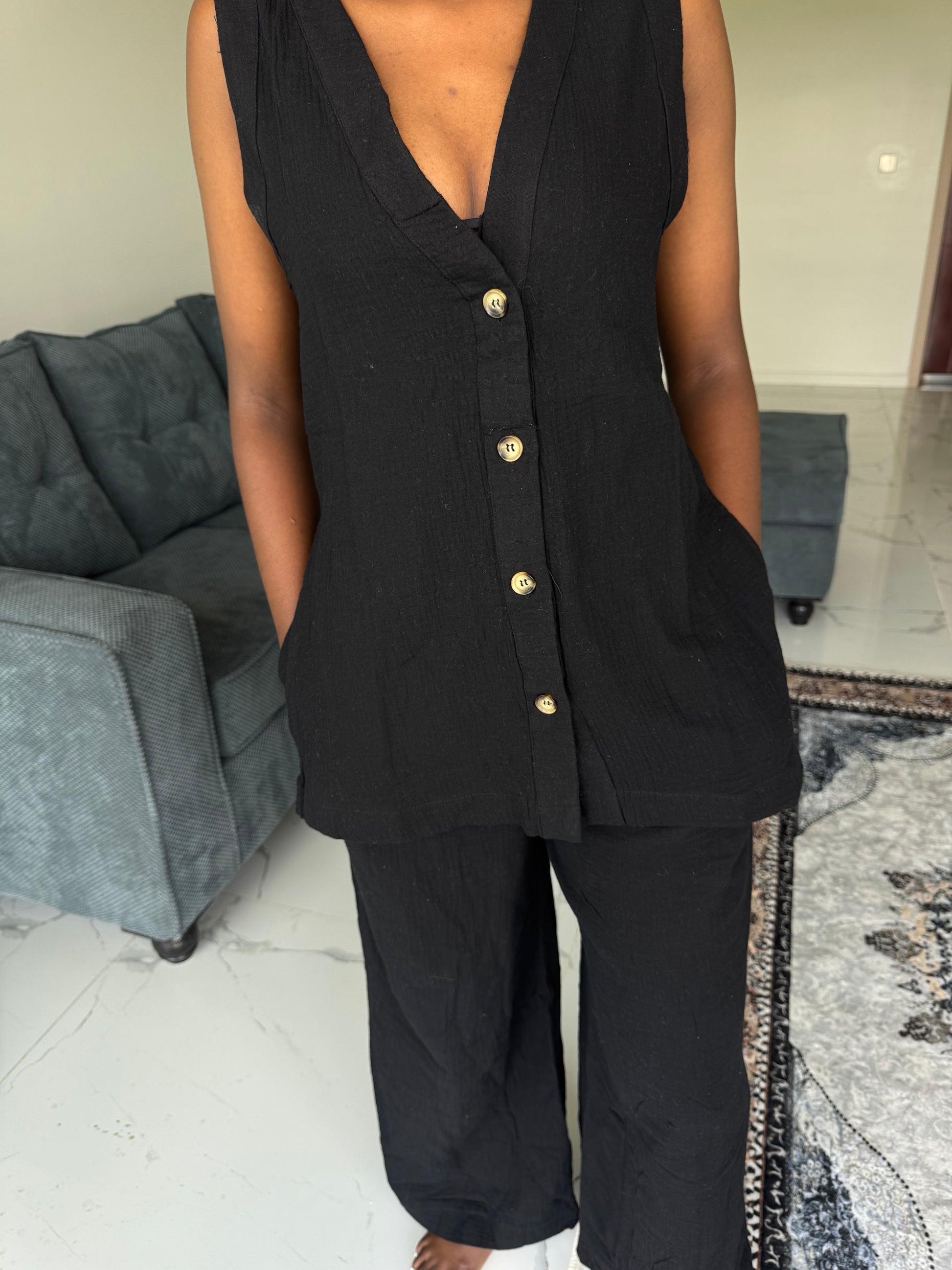 Inspired by sun-warmed streets and effortless resort style, the Marrakech linen-blend set is your go-to for a relaxed look. Crafted from a breathable linen blend, this sleeveless top and matching pants set is designed to keep you cool while looking effortlessly put together.