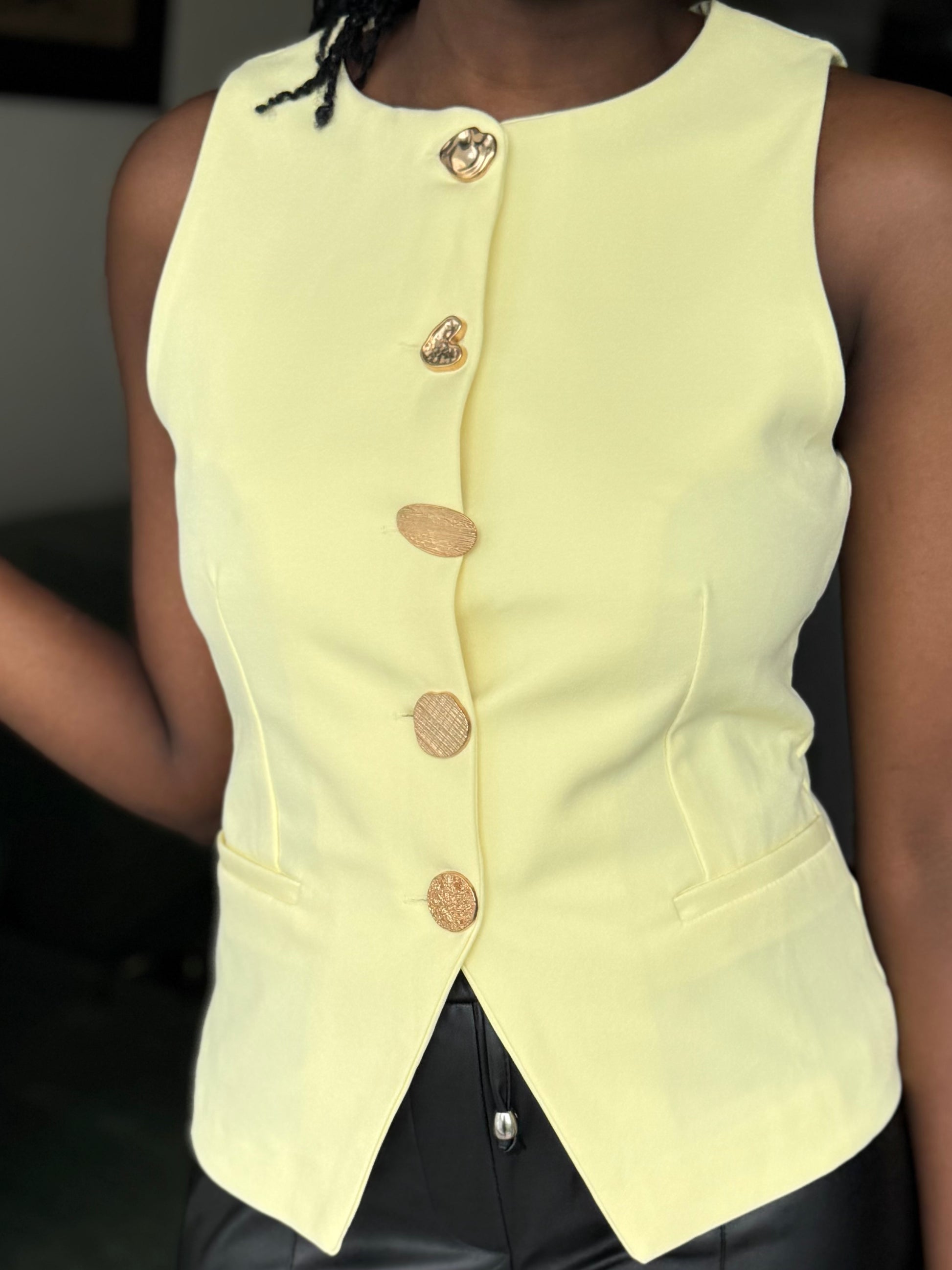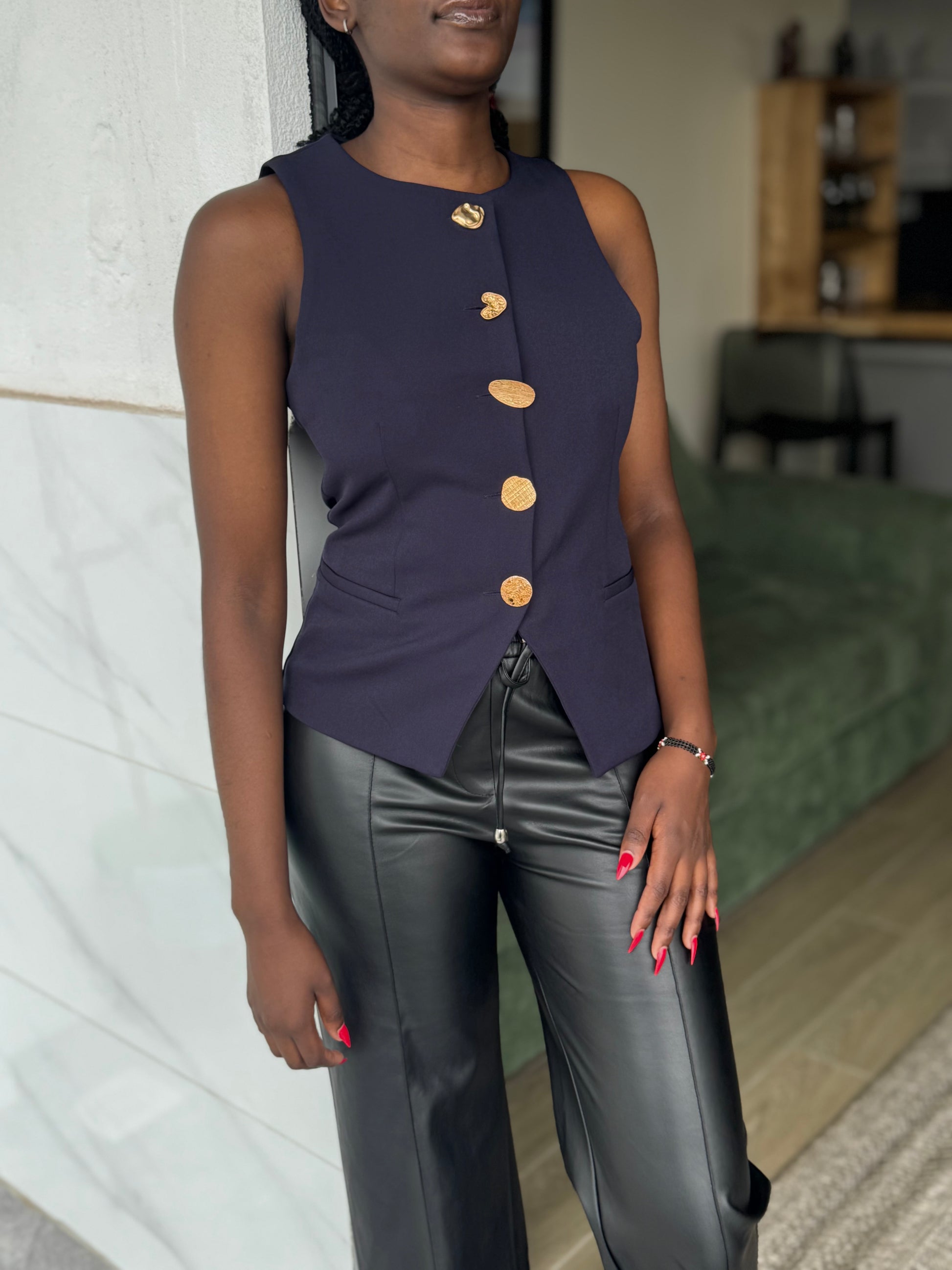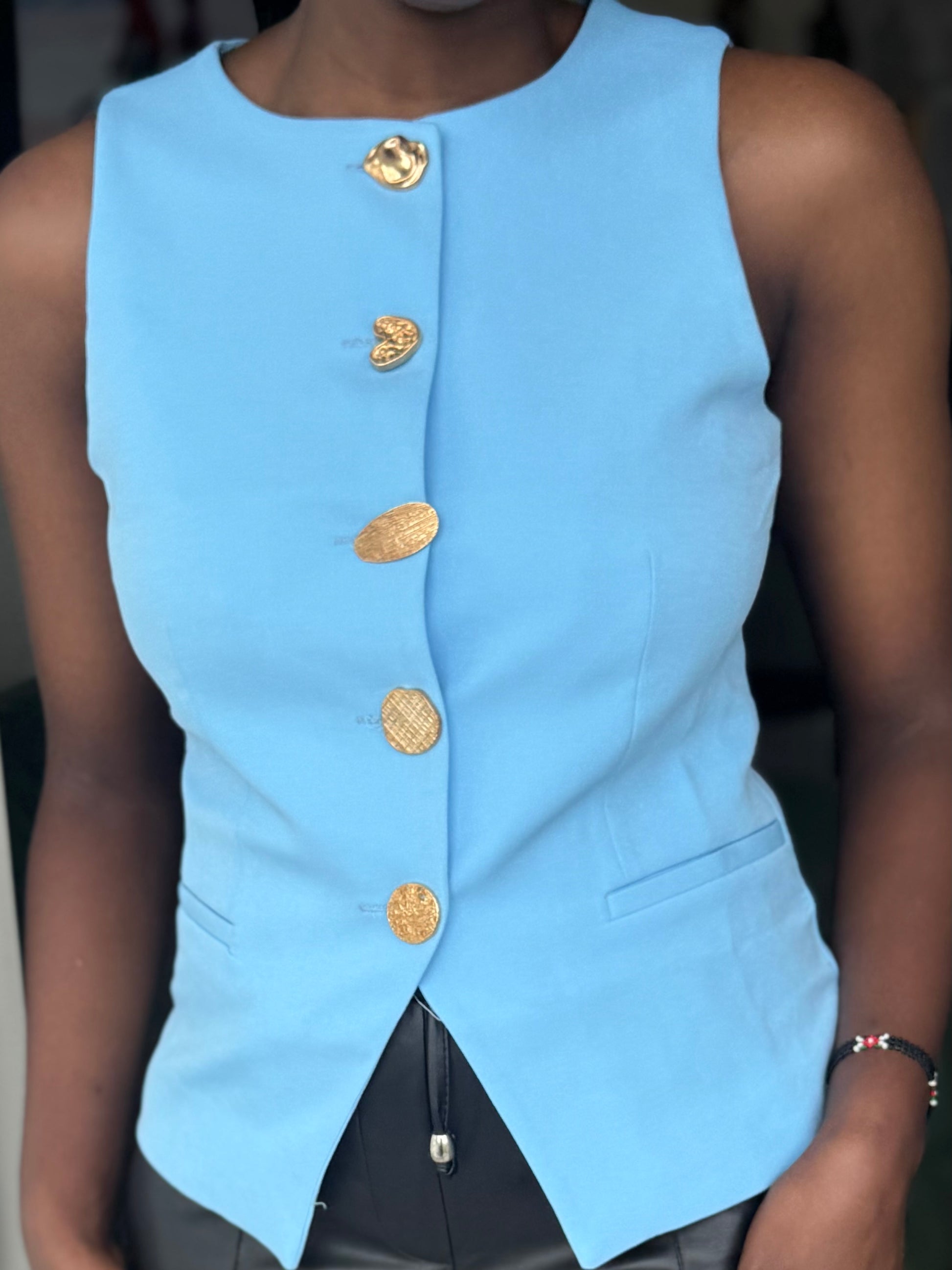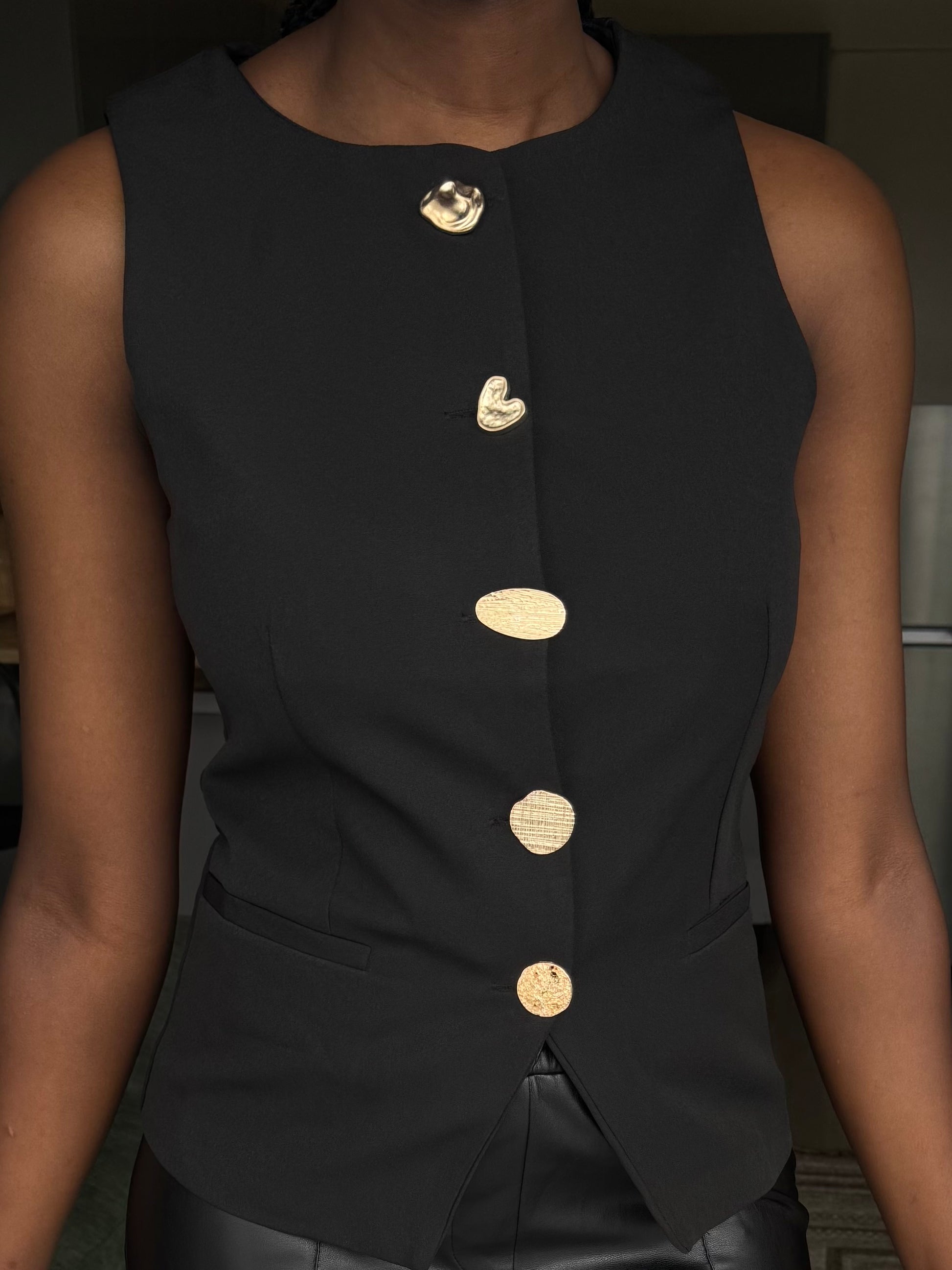 Our sleeveless Massimo vest is clean, structured, and distinct. Designed with a sharp round neckline and a flattering tailored fit, it features a row of statement gold buttons—each uniquely textured for subtle visual interest.