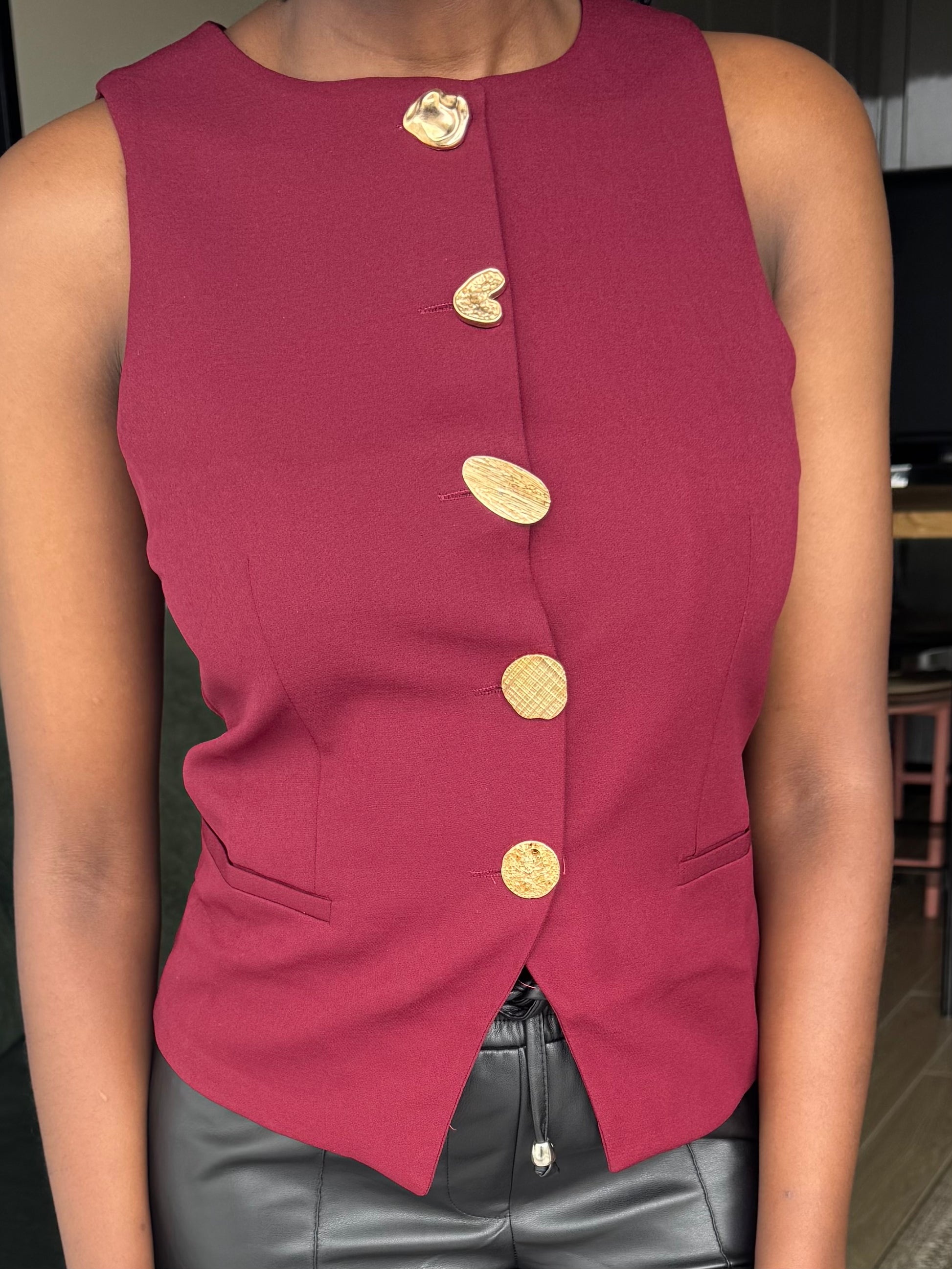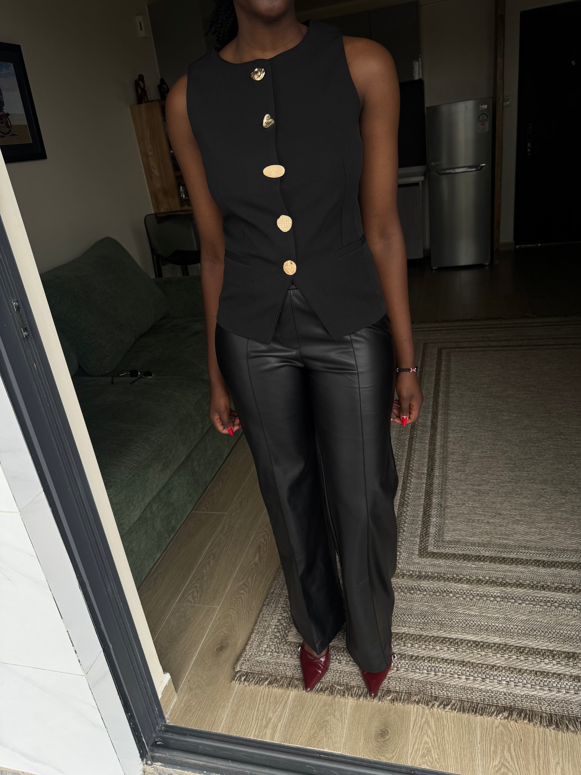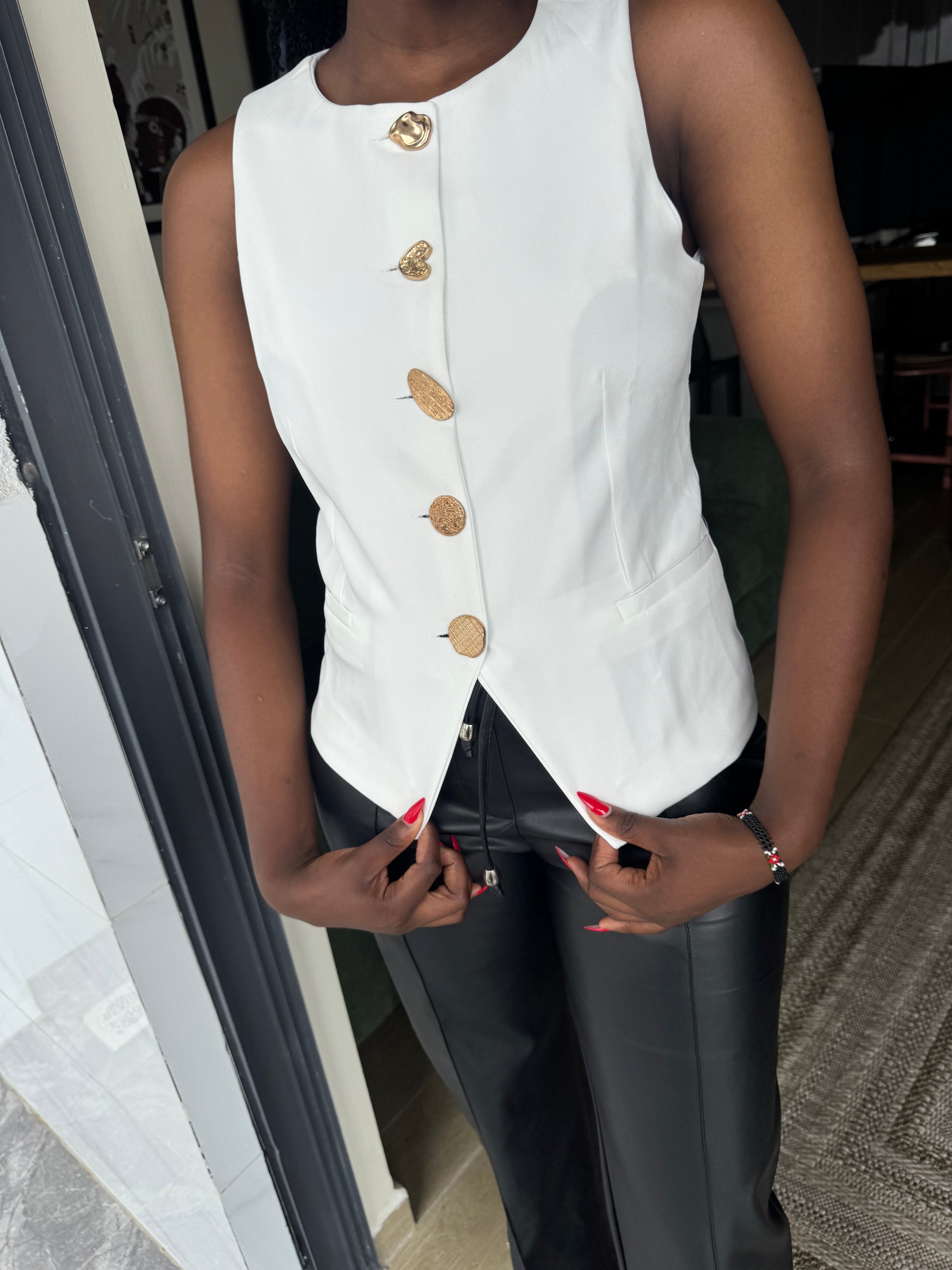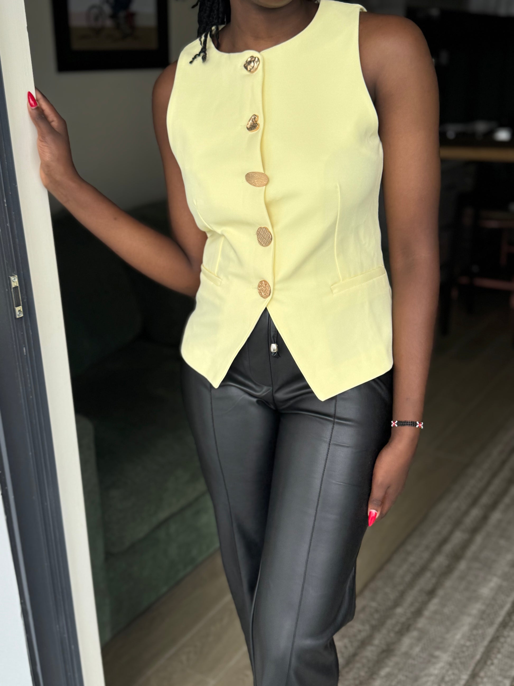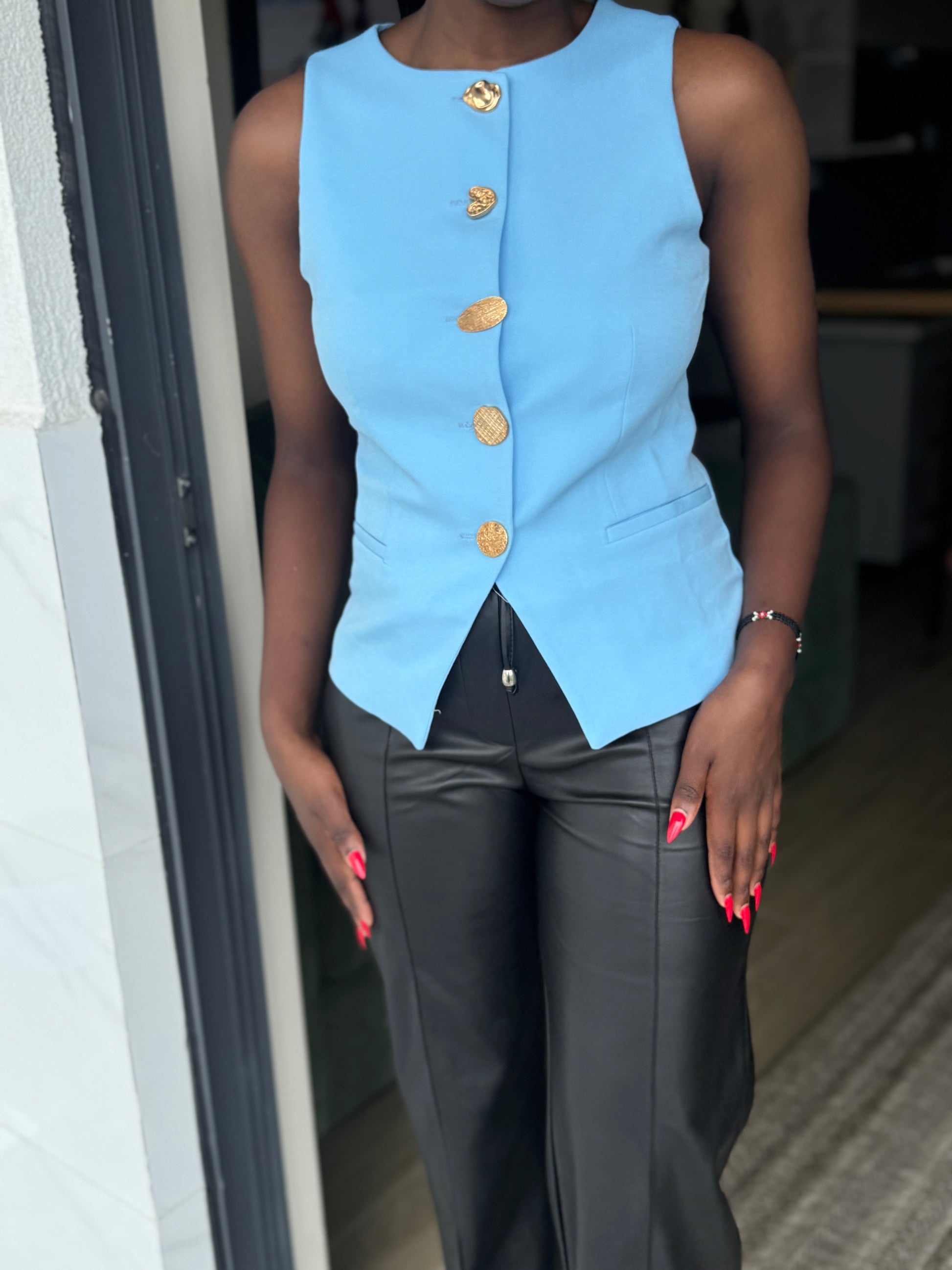 Our sleeveless Massimo vest is clean, structured, and distinct. Designed with a sharp round neckline and a flattering tailored fit, it features a row of statement gold buttons—each uniquely textured for subtle visual interest.