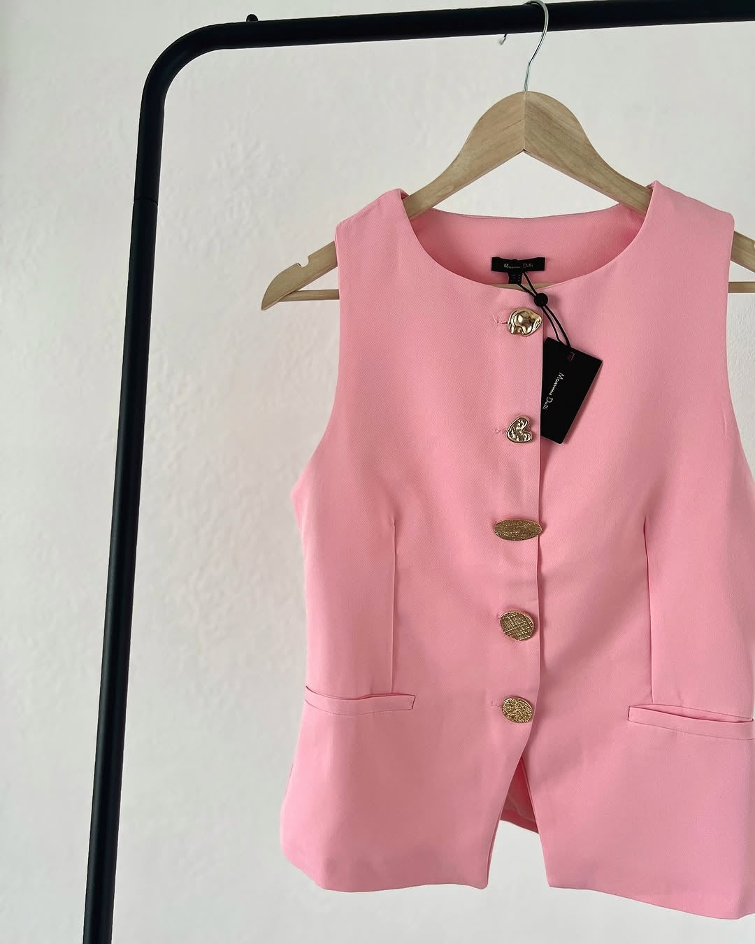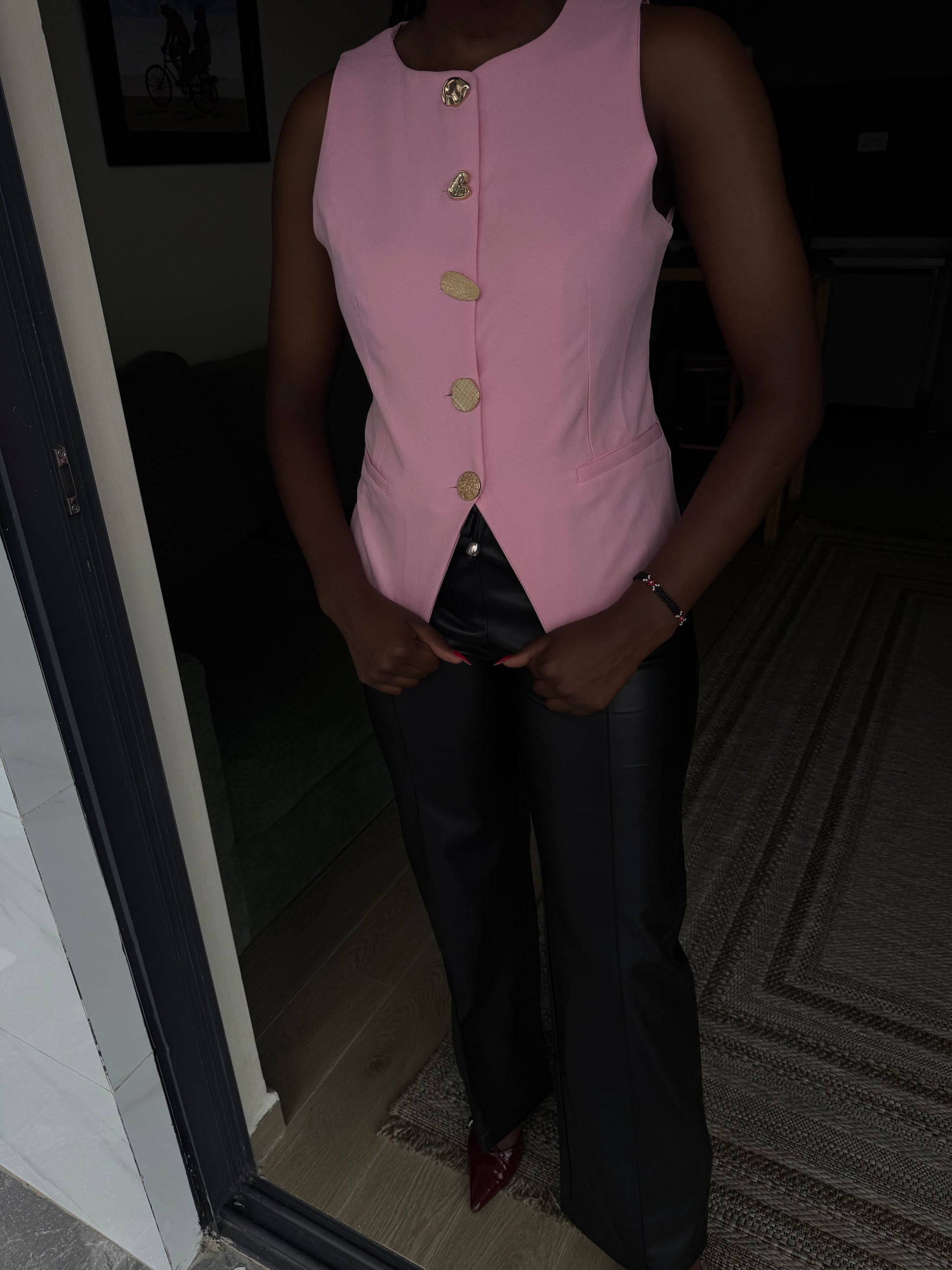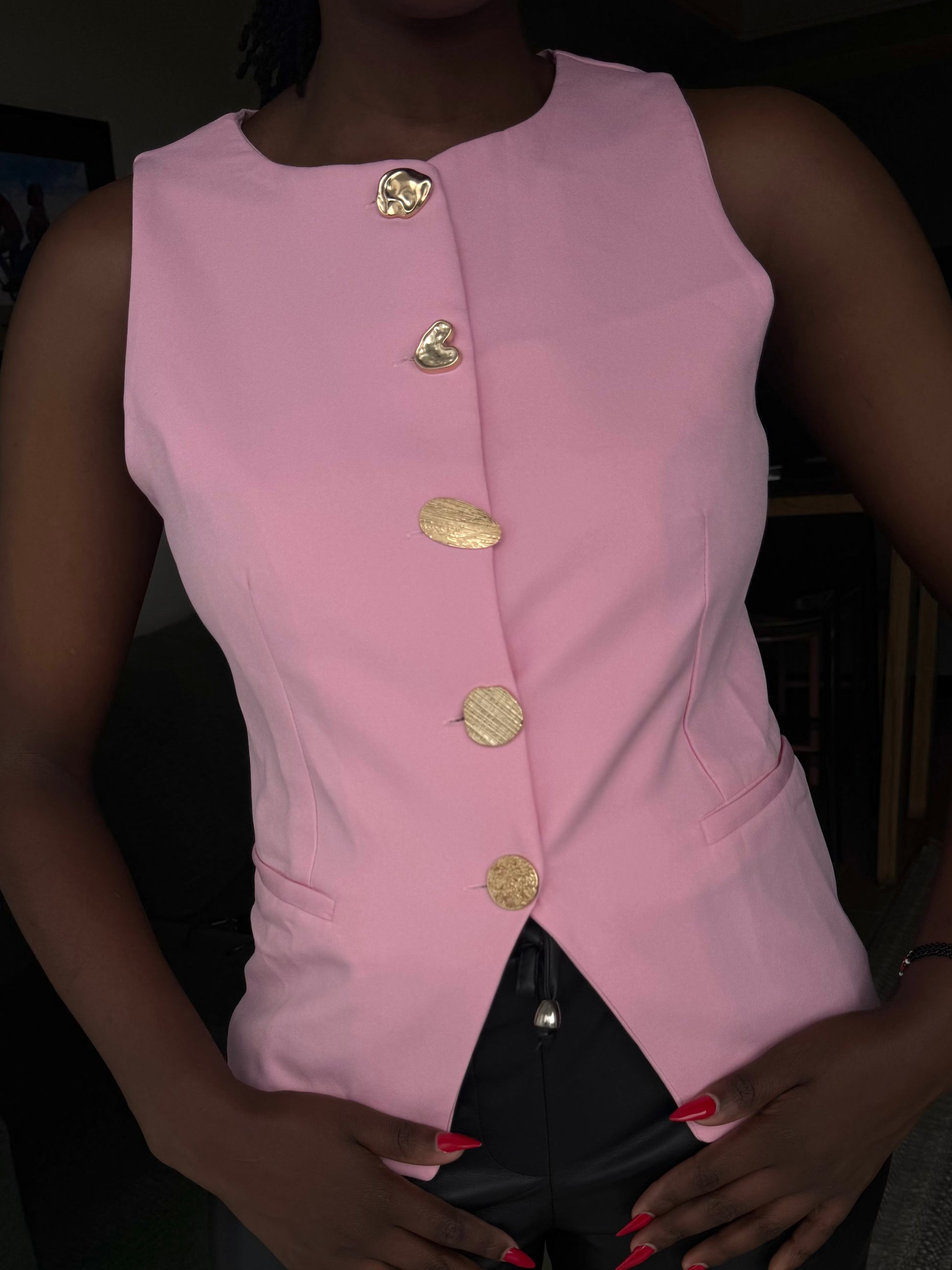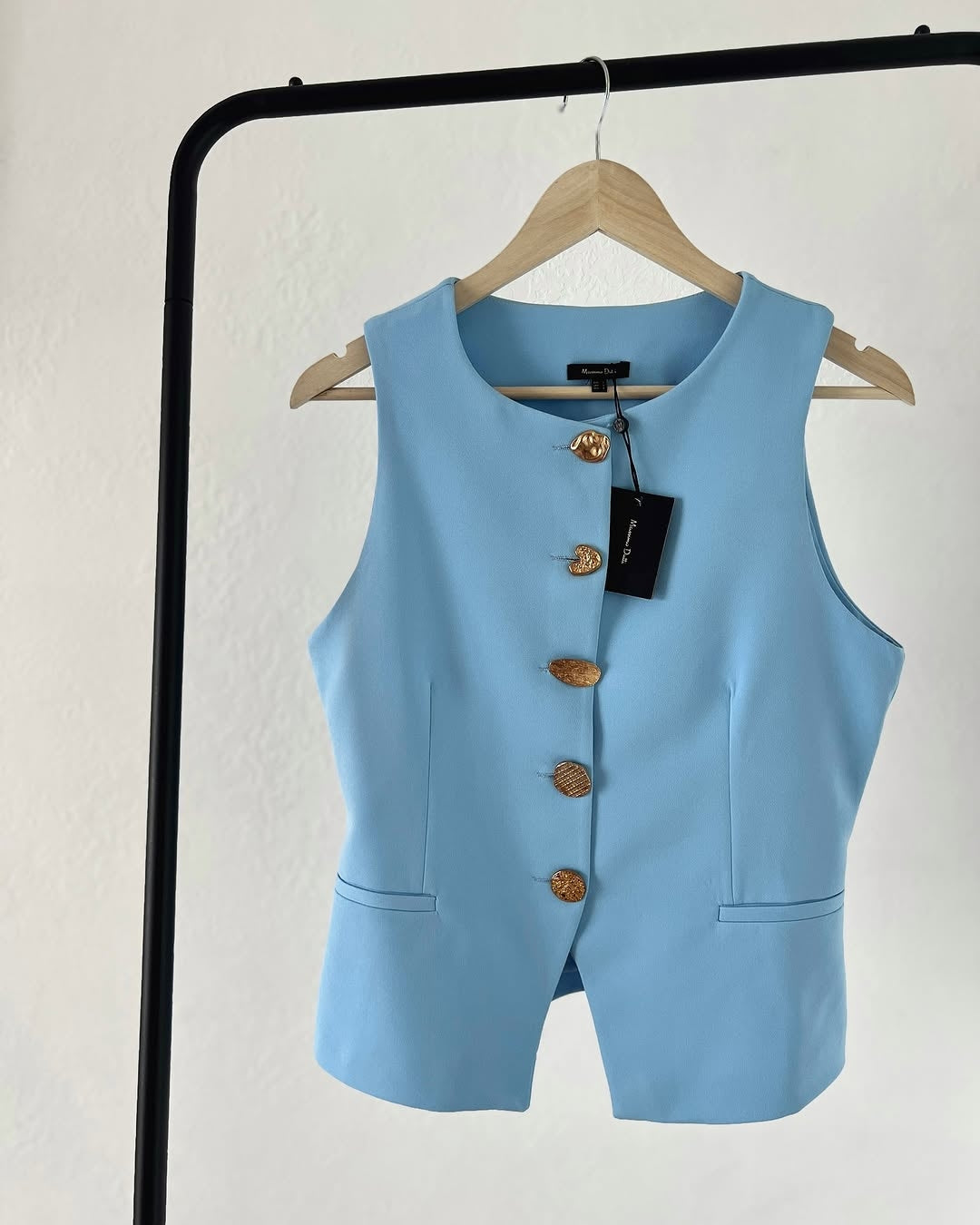 Our sleeveless Massimo vest is clean, structured, and distinct. Designed with a sharp round neckline and a flattering tailored fit, it features a row of statement gold buttons—each uniquely textured for subtle visual interest.