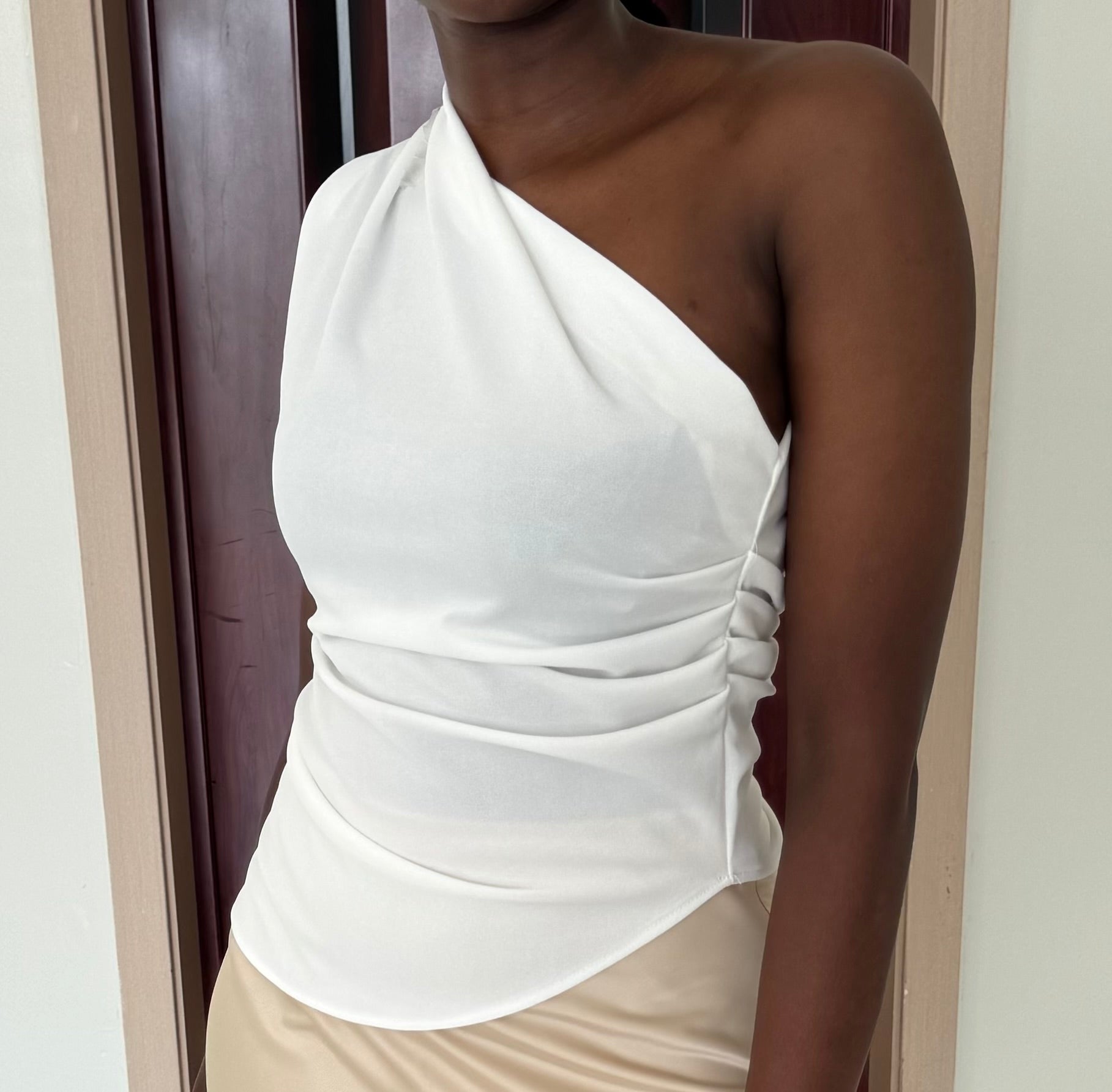 This one-shoulder asymmetrical sleeveless top is designed for clean lines and subtle statement dressing. Made from lycra fabric with slight stretch, it offers a smooth, close fit while keeping its shape. A versatile piece that works equally well dressed up or down. Available in sky blue, white, nude, and black.