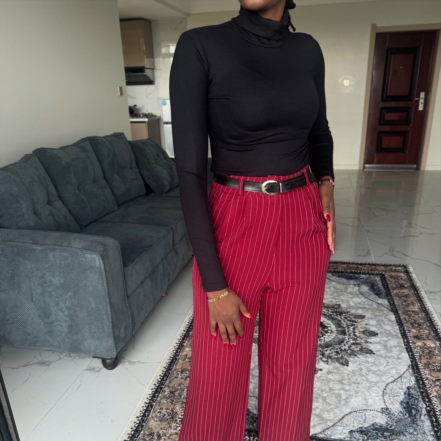 Tailored pinstripe wide-leg pants with a clean, structured finish. Designed with a high waist, straight wide leg, and belt loops, these pants offer a polished silhouette. Made from non-stretch fabric for a sharp, tailored look. Available in red and black.